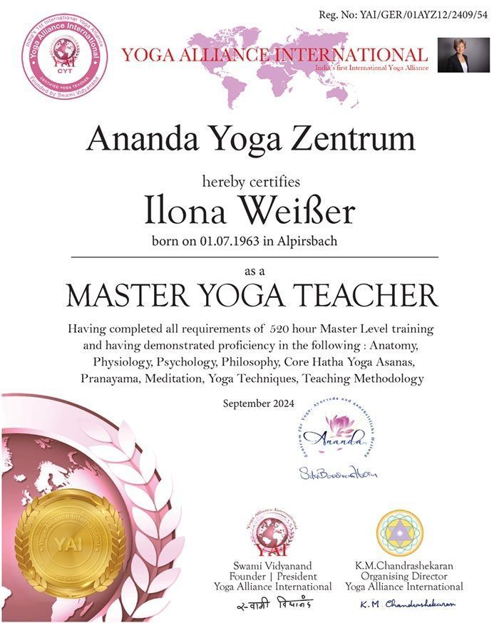 - Lizenzierte Yogalehrerin mit internationalem Masterabschluss, Hatha Yoga nach dem Prinzip Vinyasa Krama bei Claudia Schötz und Claudia Zoller, Deutscher Turnerbund e.V. (DTB), 2022-2024